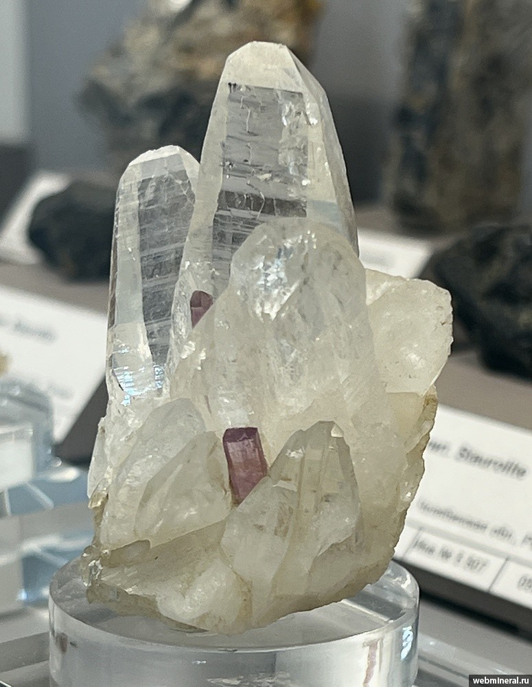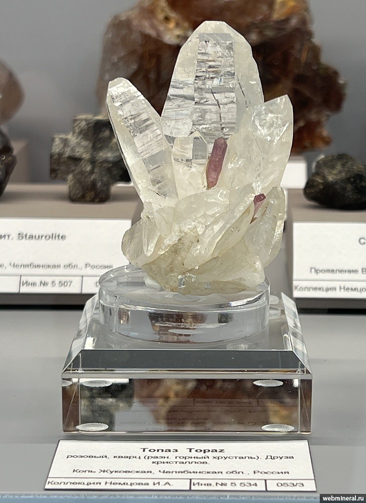 Друза кристаллов бесцветного кварца с кристаллами розового топаза длиной до 1,5 см. Образец из коллекции Немцова И.А.