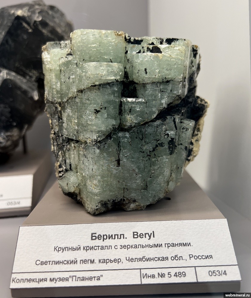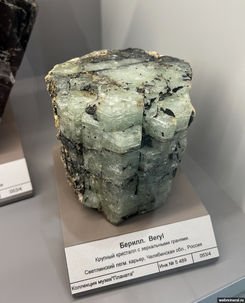 Крупный кристалл берилла с зеркальными гранями, частично покрытый черными пленками окислов марганца. Образец из коллекции Немцова И.А.