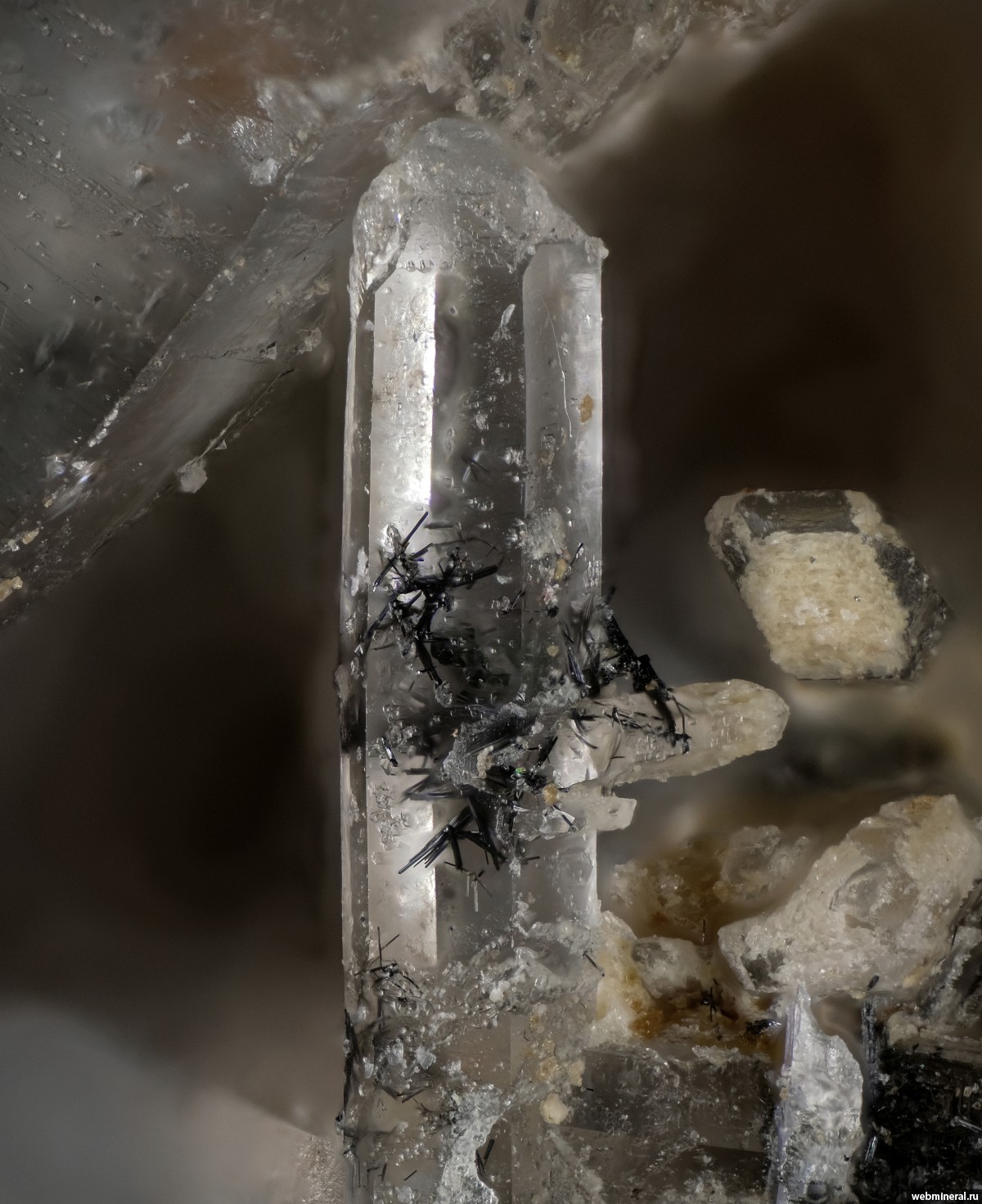 Включения иголочек рутила длиной до 0,4 мм в прозрачном кристалле кварца, наросшем на микроклиновую щётку.