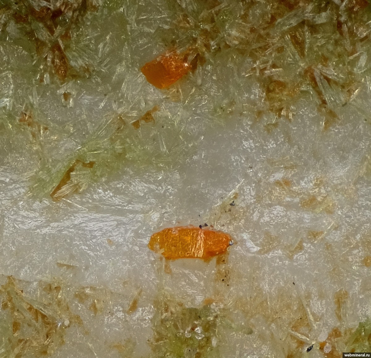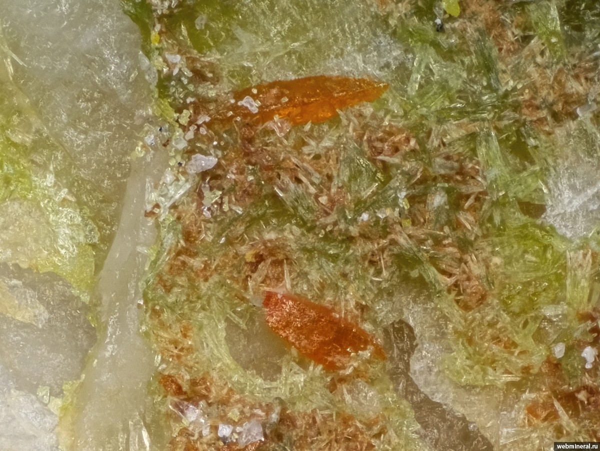Весьма мелкие (около 0,3 мм) кристаллы оранжевого вульфенита в ассоциации с зеленым игольчатым пироморфитом на стенке трещины в молочно-белом кварце.