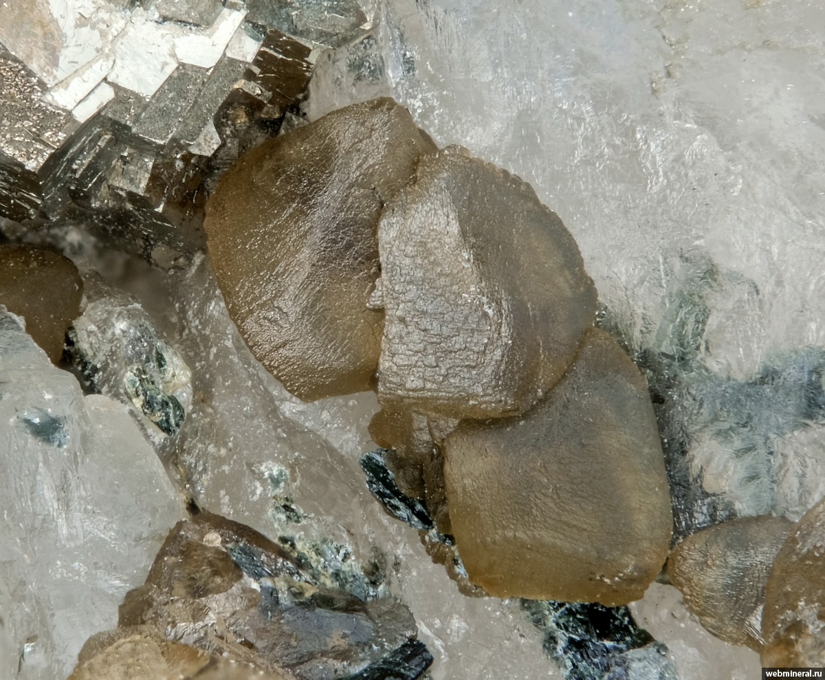 Кристаллы сидерита с примесью цинка ((Fe0.75,Zn0.25)CO3) (ширина поля зрения – 3 мм), в ассоциации – пирит; всё в кварце. Находка - июнь 2025 года.