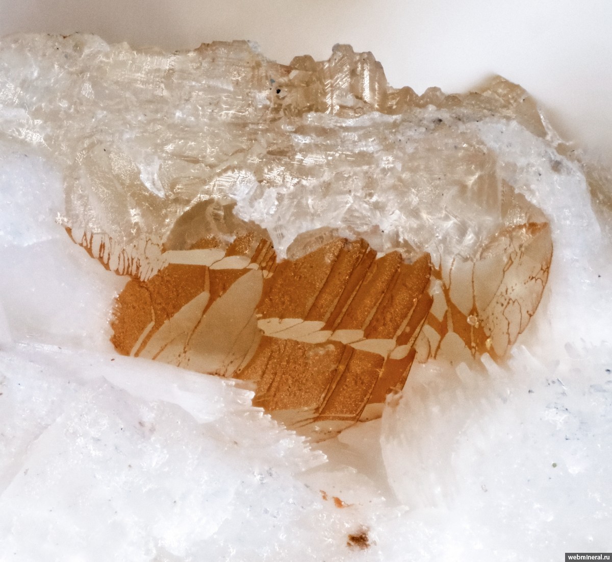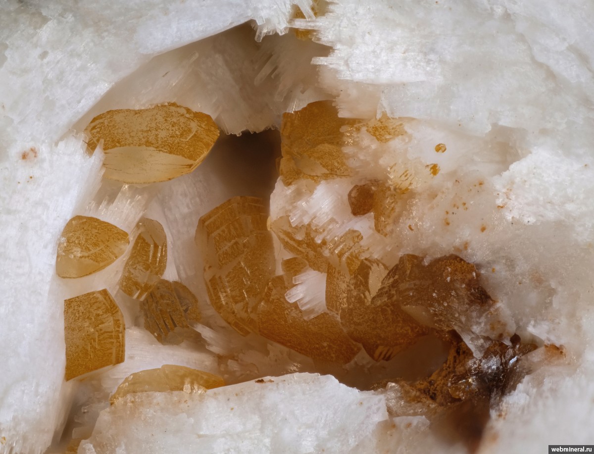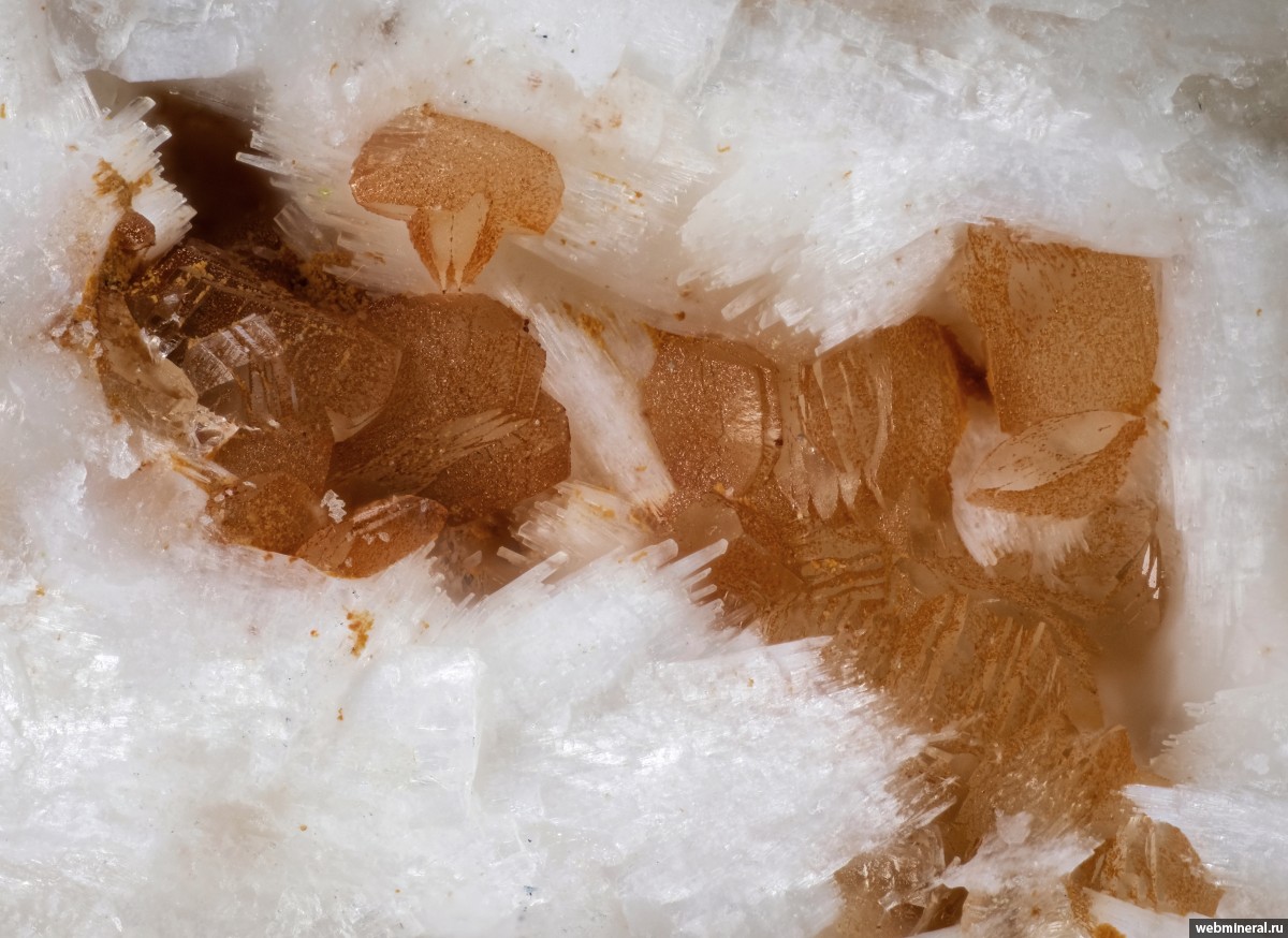 Оранжевые кристаллы бёмита, местами с листоватым гиббситом, в кавернах шпреуштейна (псевдоморфоза натролита по нефелину).