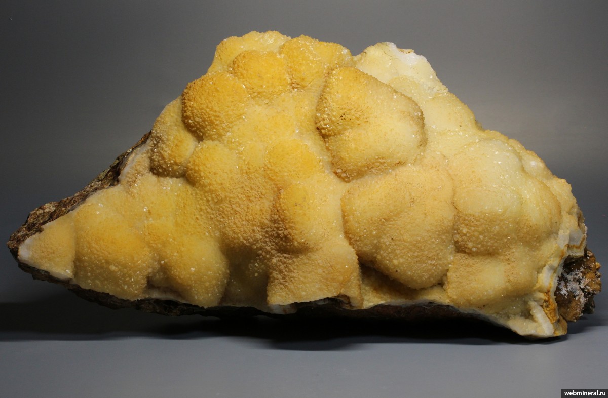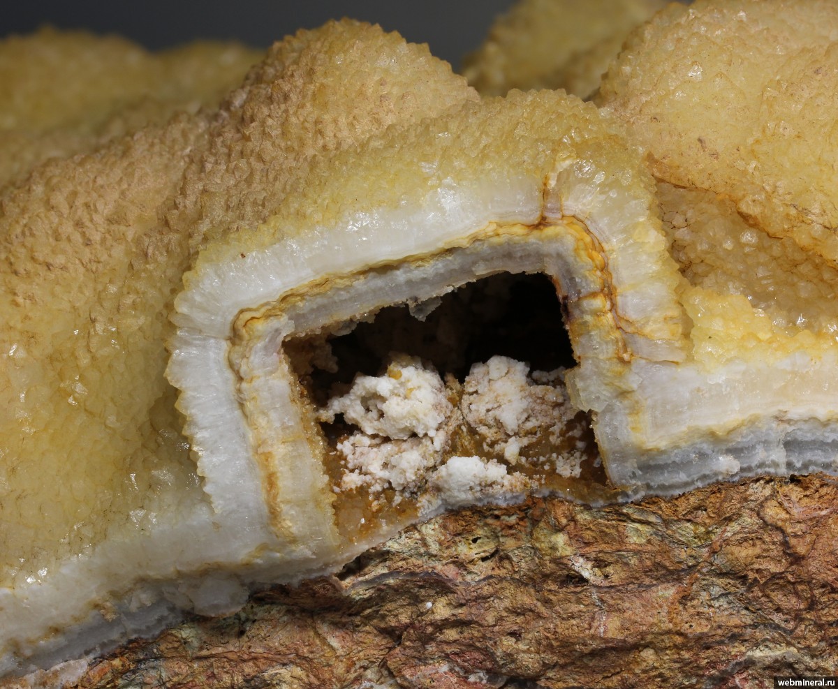 Корка сложенная в основании халцедоном, а на поверхности желтым ожелезненным кварцем. Корка покрывает изометричные кристаллы кальцита на стенке трещины в серпентините. На фото 2 виден скол такой псевдоморфозы облекания с реликтами белого зернистого кальцита внутри. Находка - 2025 год.