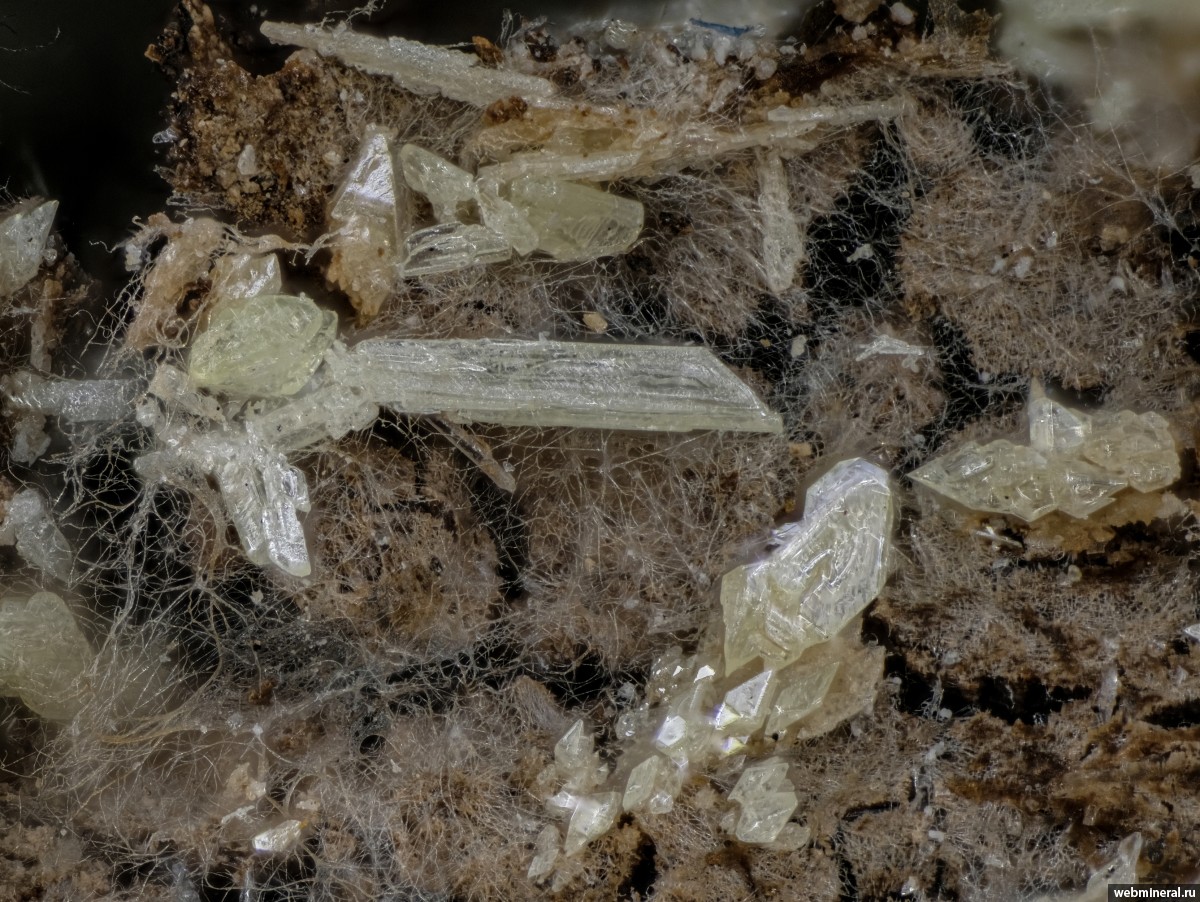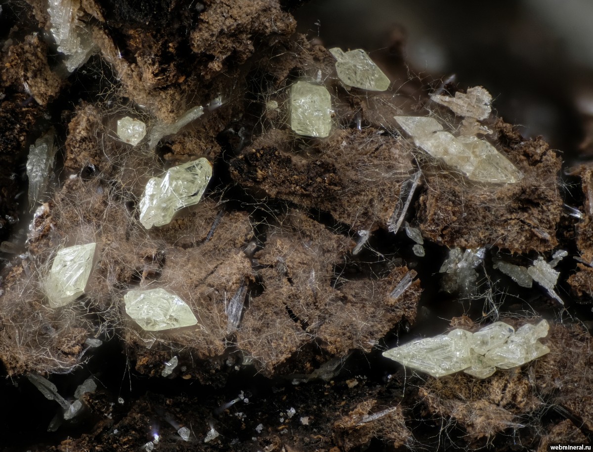 Мелкие, частью скелетные кристаллики светло-желтой серы размером до 0,5 мм и удлиненные (до игольчатых) кристаллы белого гипса размером до 1 мм на стенках трещин в буром угле. Кристаллы гипса и серы соседствуют с тонковолокнистыми скоплениями грибов (типа обычной плесени) которые выросли в комфортных условиях богатого органикой сырого угольного пласта, подогретого теплом подземного пожара. Находка - 2025 год.