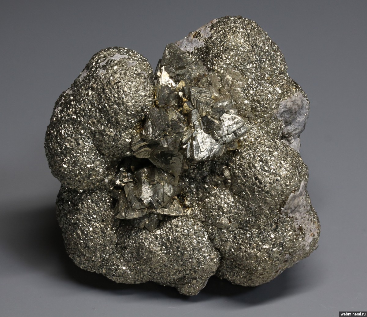 Конкреция причудливой формы сложенная мелкокристаллическим пиритом, на которую нарастают блочные октаэдрические кристаллы пирита второй генерации размером до 1,5 см. Конкреция пирита изначально практически полностью была покрыта корочкой светло-серого кальцита, который был частично растворен в лимонной кислоте. Находка - 2025 год.