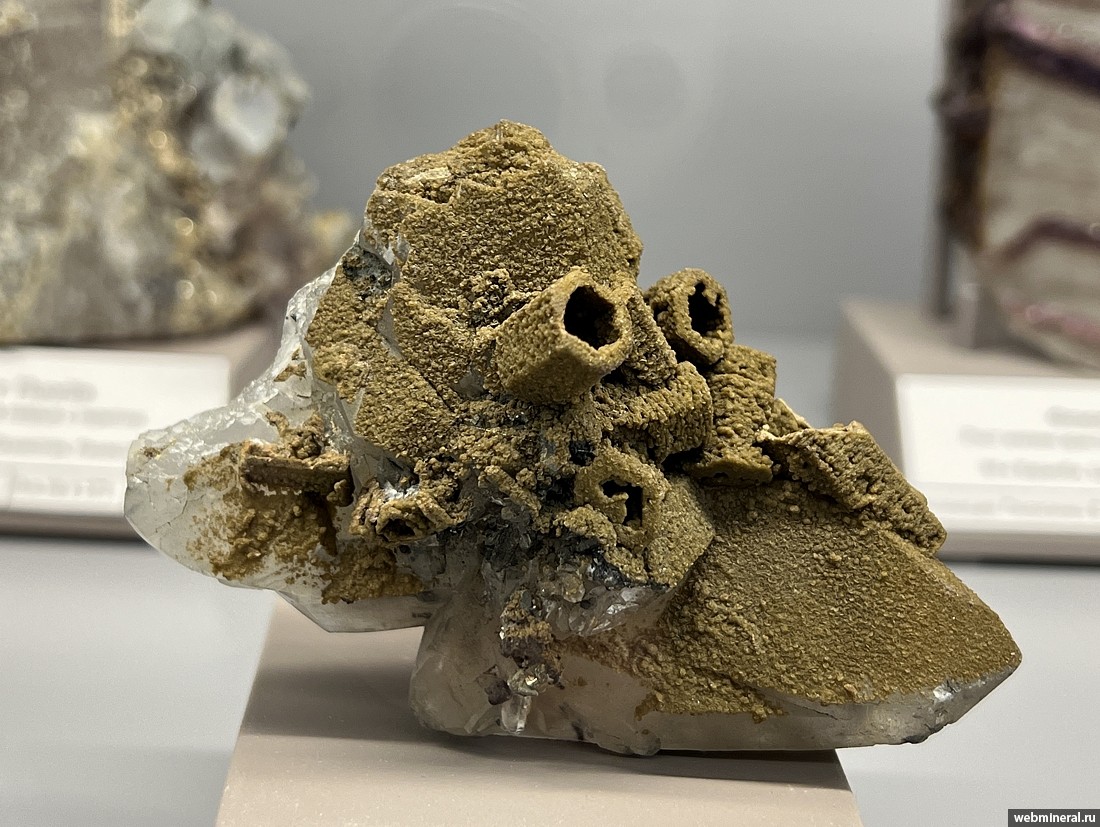 Псевдоморфозы облекания ("футляры") сидерита по бериллу (???) на кварце. Образец из коллекции Пелепенко В.А.