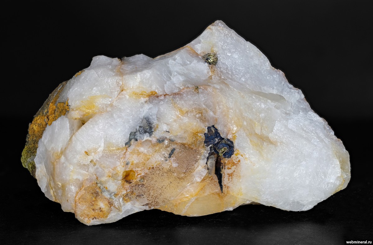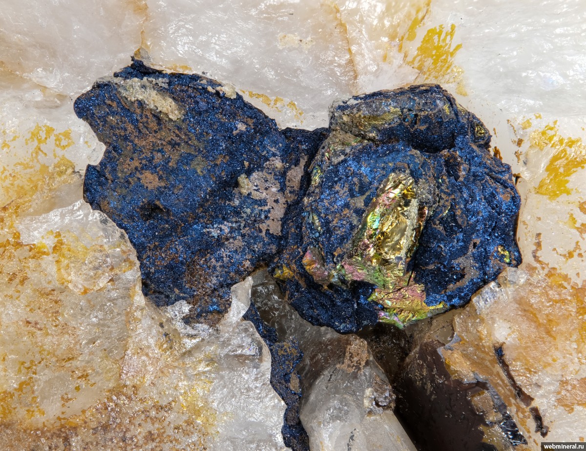 Частичная псевдоморфоза темного с синей побежалостью ковеллина, по крупному зерну халькопирита в кварце.