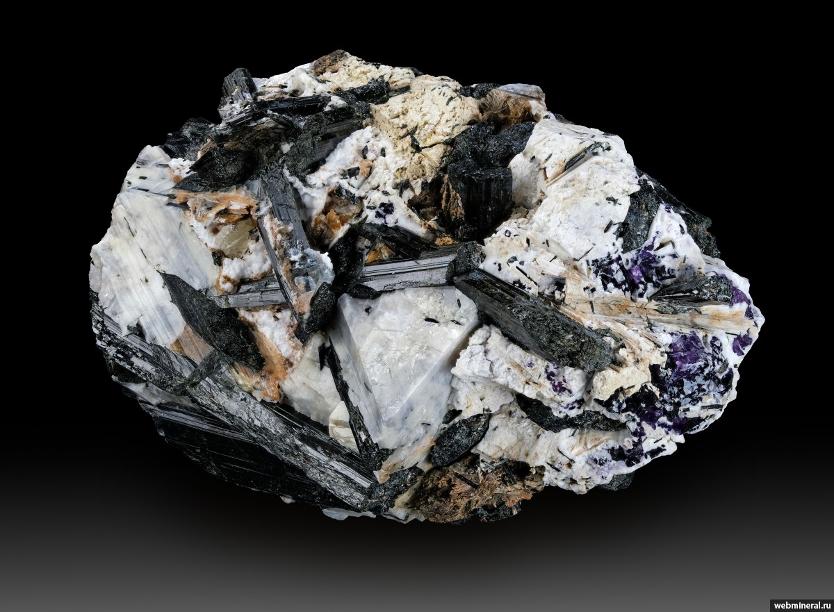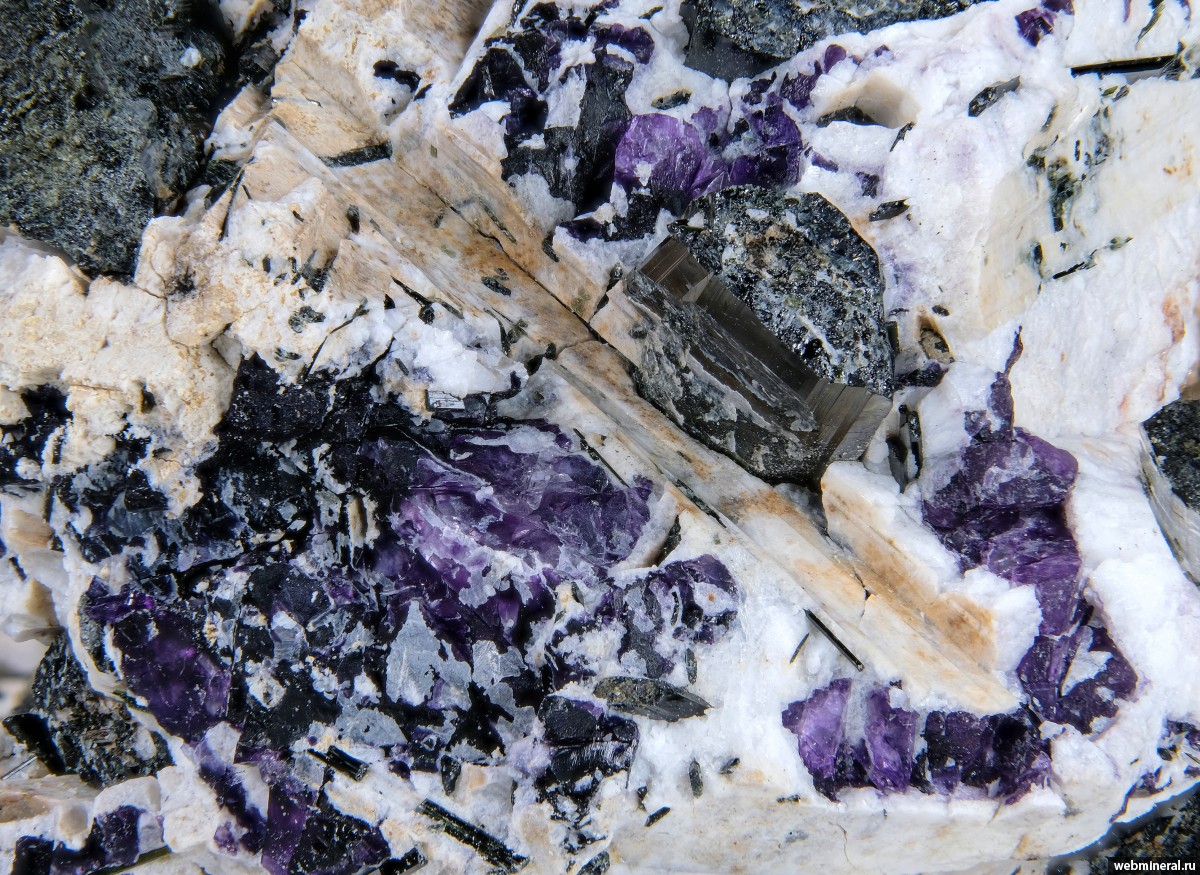 Зёрна фиолетового флюорита и кристаллы чёрного эгирина и в полевом шпате. Находка - август 2025.