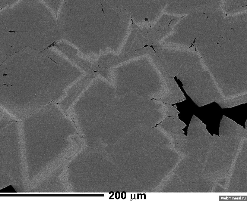 Зональные кристаллы высокомедного цинколибетенита, нарастающие на кристаллы аугелита; зональность обусловлена повышенными содержаниями мышьяка до 11.8.% вес. As2O5. Изображение в режиме отраженных электронов (обр. ST 7432, колл. В.И. Степанова).