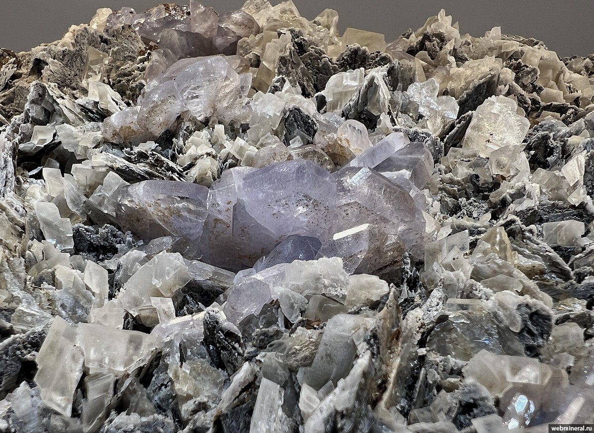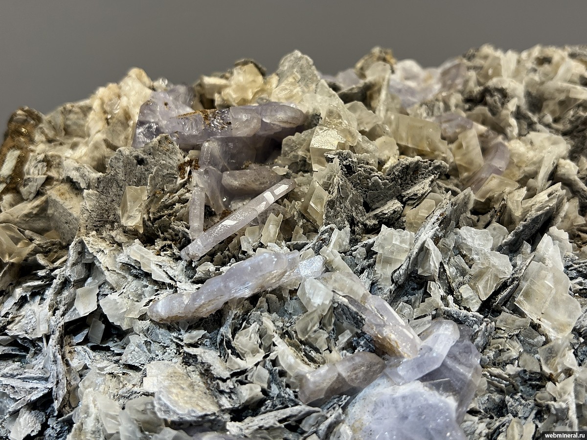 Таблитчатые кристаллы сиреневого апатита размером до 4 см с кальцитом и хлоритом на породе. Образец из коллекции Миркамалова А.М.