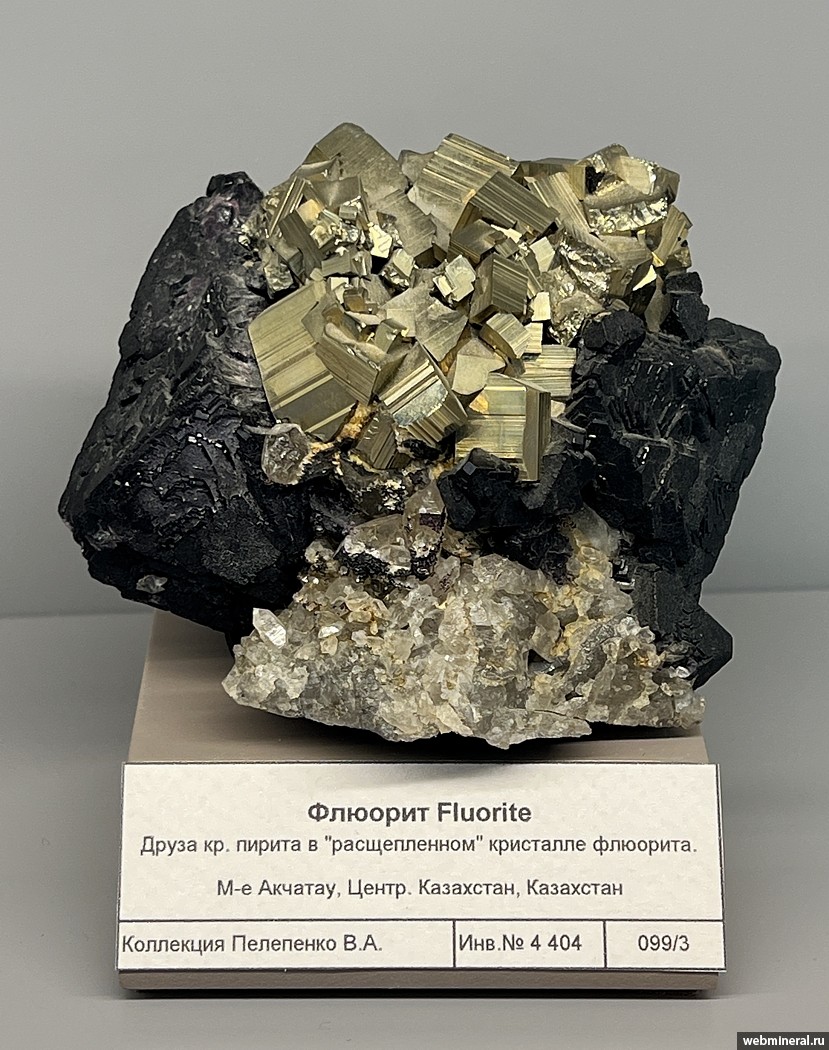 Друза кристаллов пирита в "расщепленном" кристалле флюорита, нарастающего на светло-серый кварц. Образец из коллекции Пелепенко В.А.