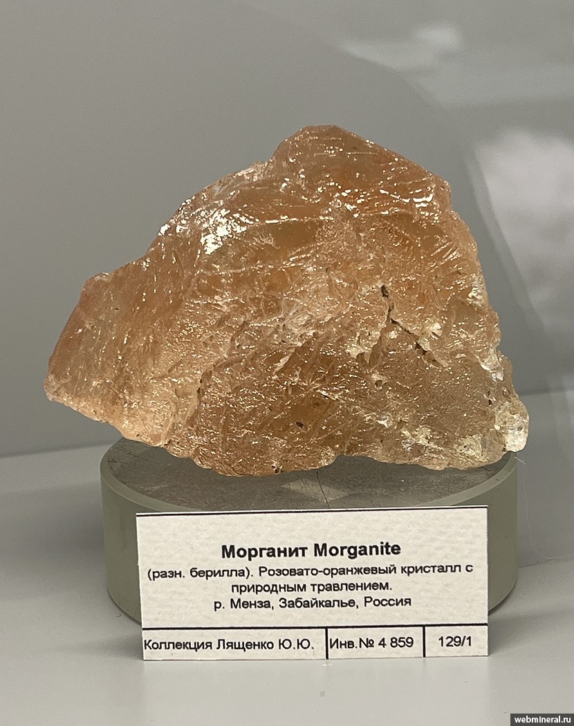 Частично растворенный кристалл розовато-оранжевого берилла. Образец из коллекции Лященко Ю.Ю.