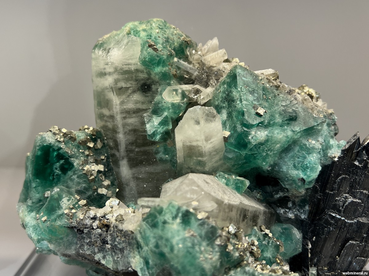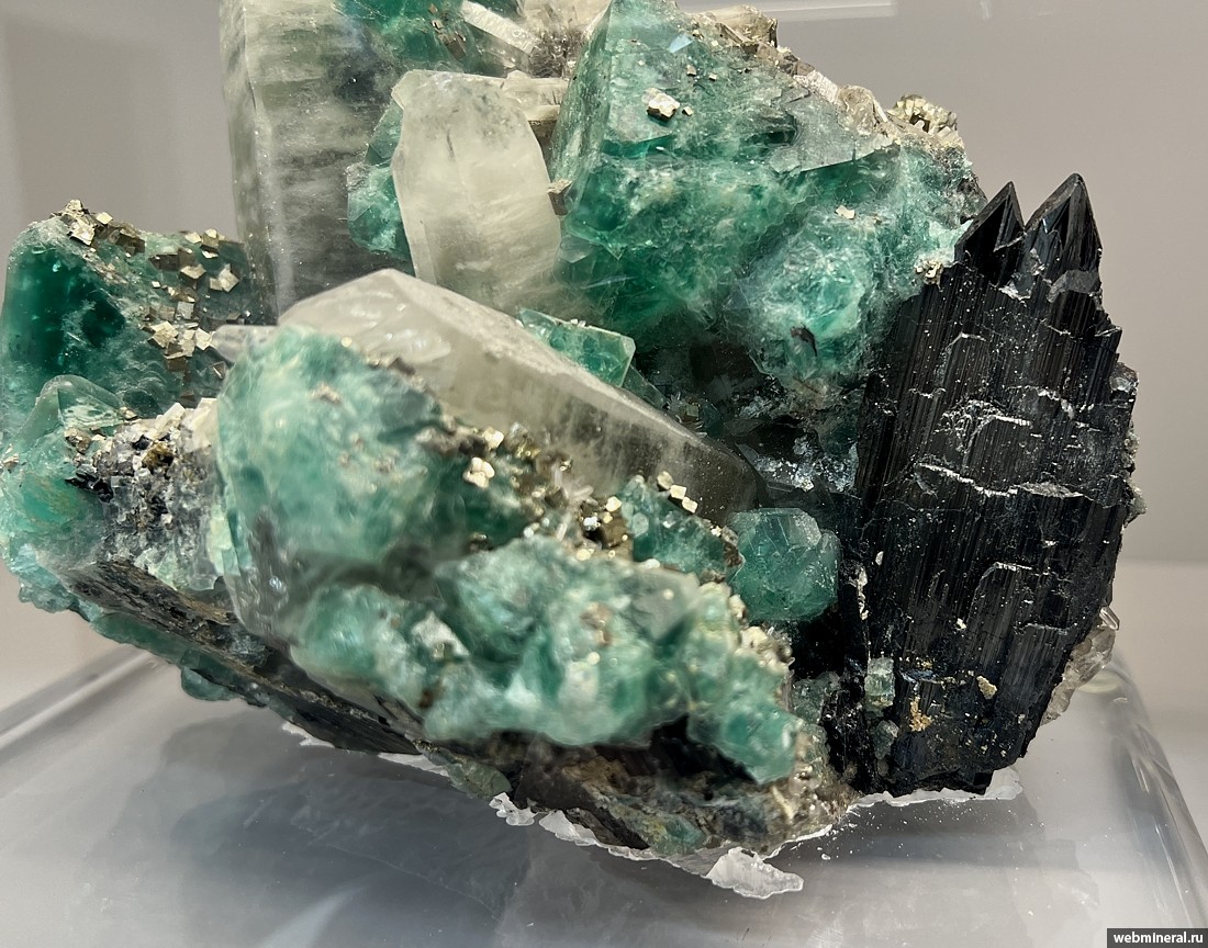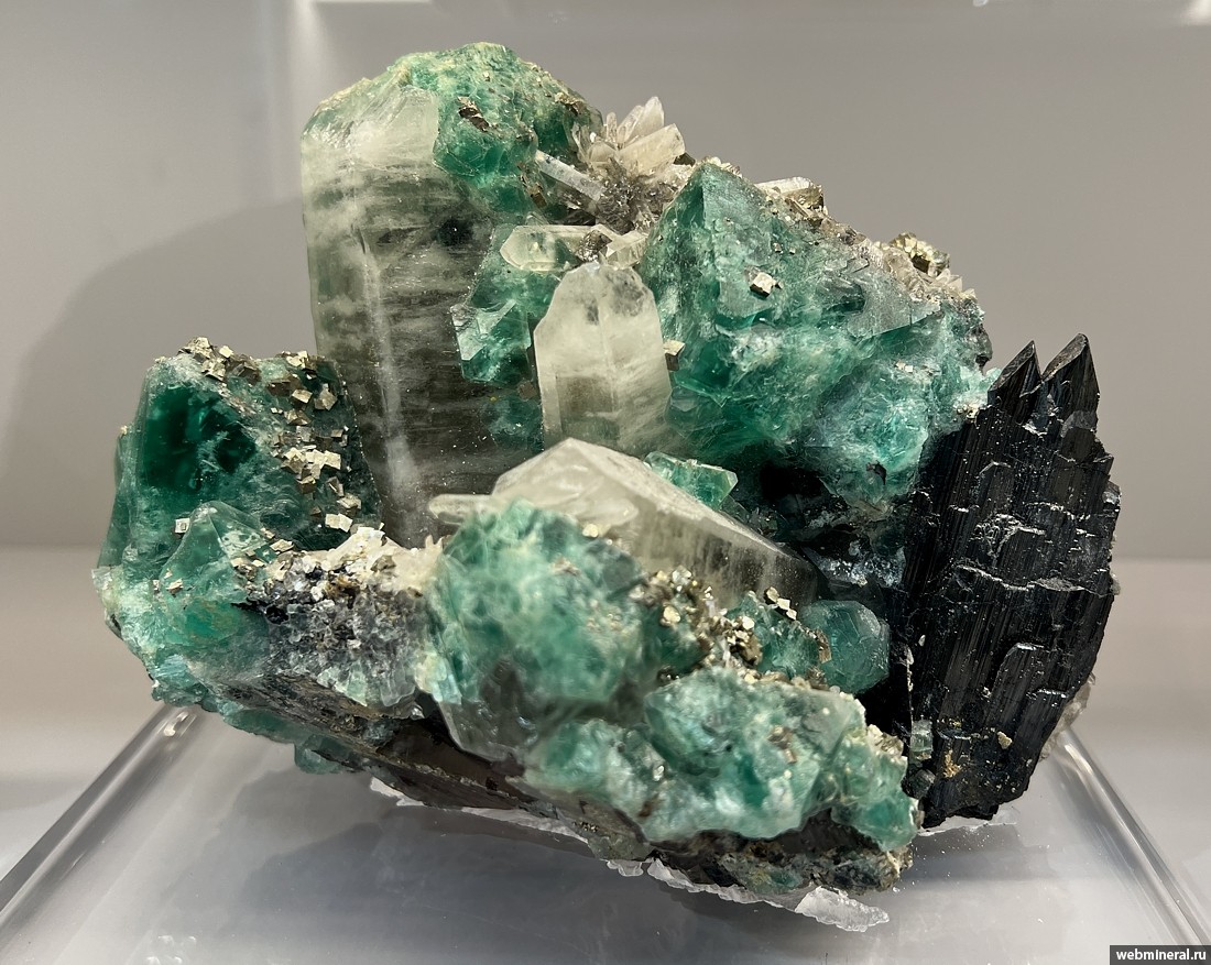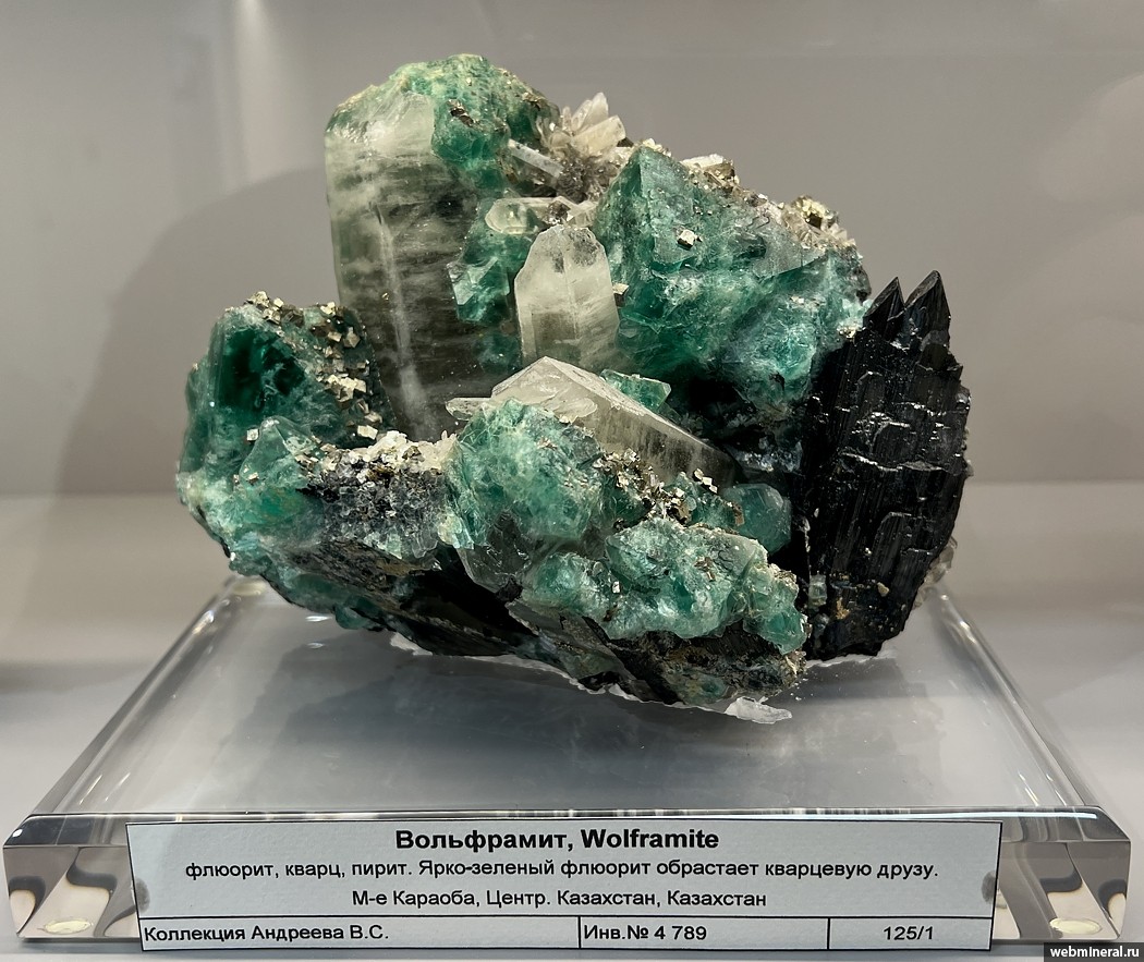 Друза кристаллов кварца и ярко-зеленого флюорита с кристаллом вольфрамита высотой около 8 см и мелкими кубическими кристаллами пирита. Образец из коллекции Андреева В.С.