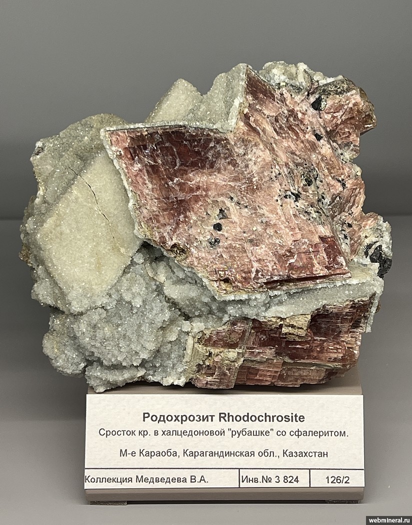 Скол на сростке кристаллов родохрозита в кварцевой рубашке со сфалеритом. Образец из коллекции Медведева В.А.