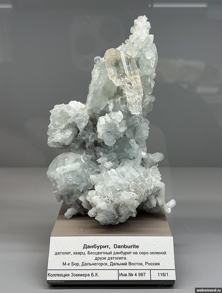Частично растворенный бесцветный кристалл данбурита длиной около 4,5 см на друзе серо-зеленого датолита с белым кварцем. Образец из коллекции Зоммера Б.К.