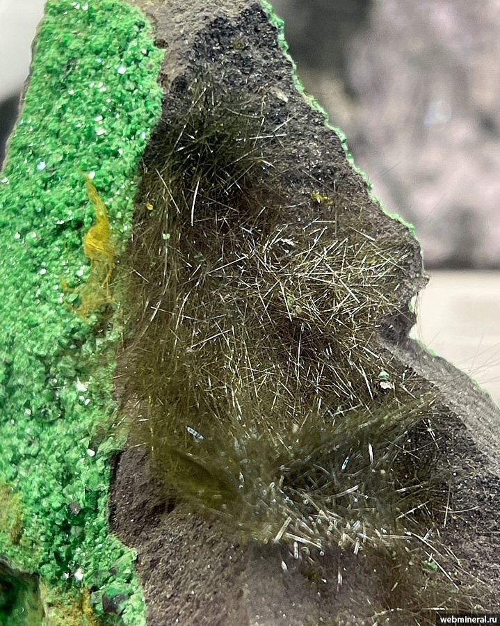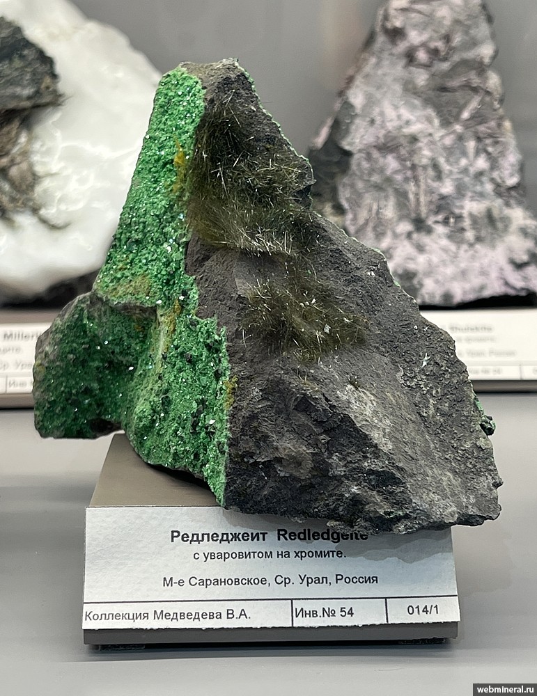 Игольчатые кристаллы редледжеита длиной до 1 см с уваровитом на хромите. Образец из коллекции Медведева В.А.