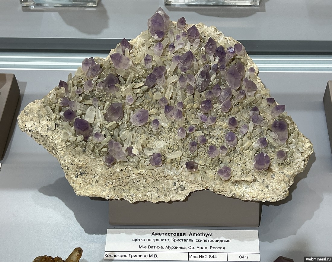 Щетка скипетровидных кристаллов аметиста размером до 2 см на граните. Образец из коллекции Гришина М.В.