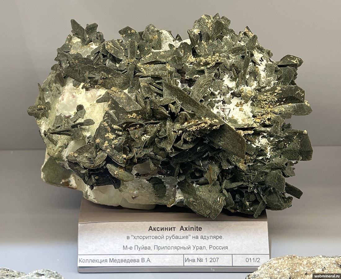 Кристаллы аксинита в "хлоритовой рубашке" на адуляре. Образец из коллекции Медведева В.А.