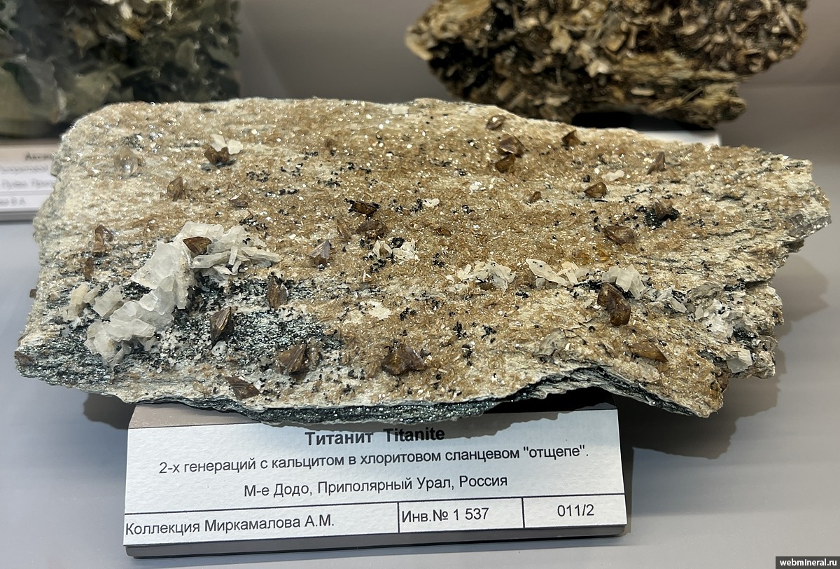 Кристаллы титанита двух генерация размером до 1 см с кальцитом в хлоритовом сланцевом "отщепе". Образец из коллекции Миркамалова А.М.