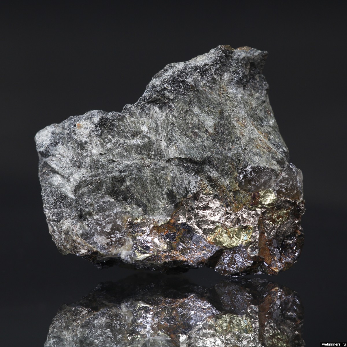 Шелковистые на сколе, ориентированные псевдоморфозы светлого голубовато-серого магнезиоферригорнблендита по раннему пироксену скарнов в образце контактируют с частью сульфидного гнезда. Ранние сульфиды - розовато-бронзовый пирротин и желтый халькопирит проросли табличками серого молибденита.