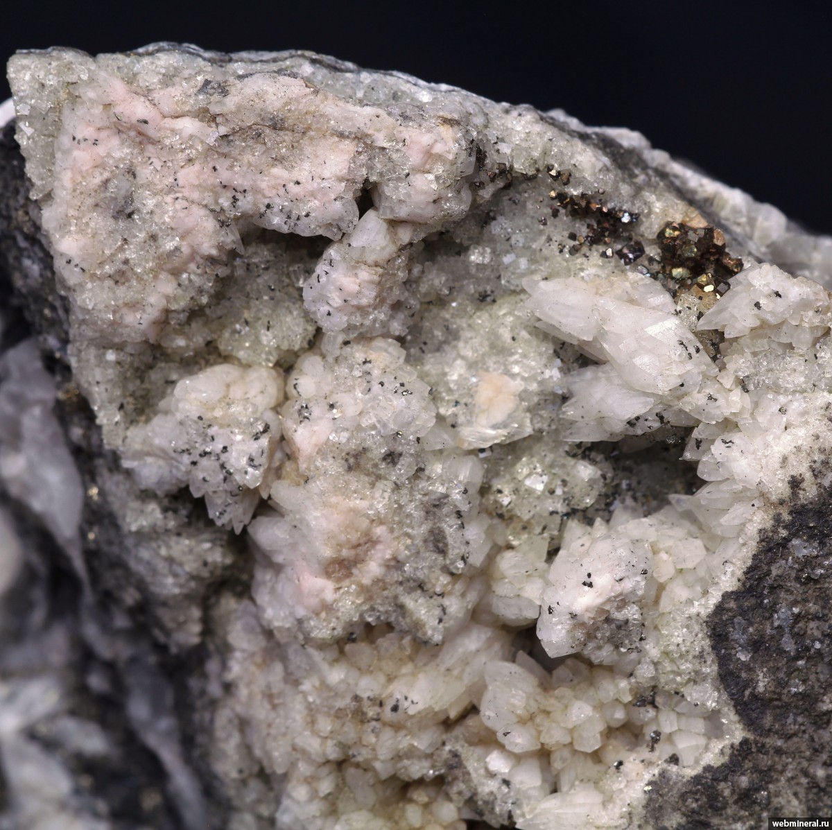 Скаленоэдрические кристаллы бесцветного и розоватого кальцита поверх кубиков слегка зеленоватого флюорита и мелких кристалликов пирита (с побежалостью)