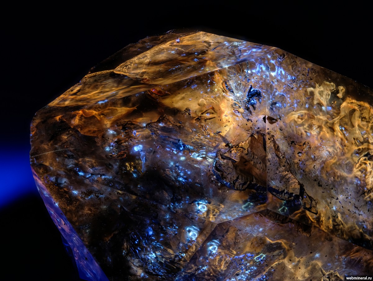 Двухголовый кристалл дымчатого кварца с включениями нефти/битума, хорошо различимыми в ультрафиолетовом свете (смотри дополнительные фото).