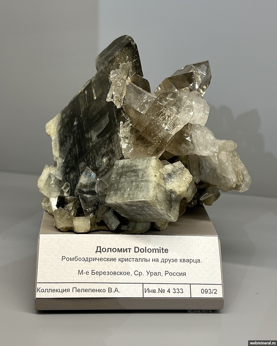 Ромбоэдрические кристаллы желтовато-серого доломита на друзе кварца. Образец из коллекции Пелепенко В.А.
