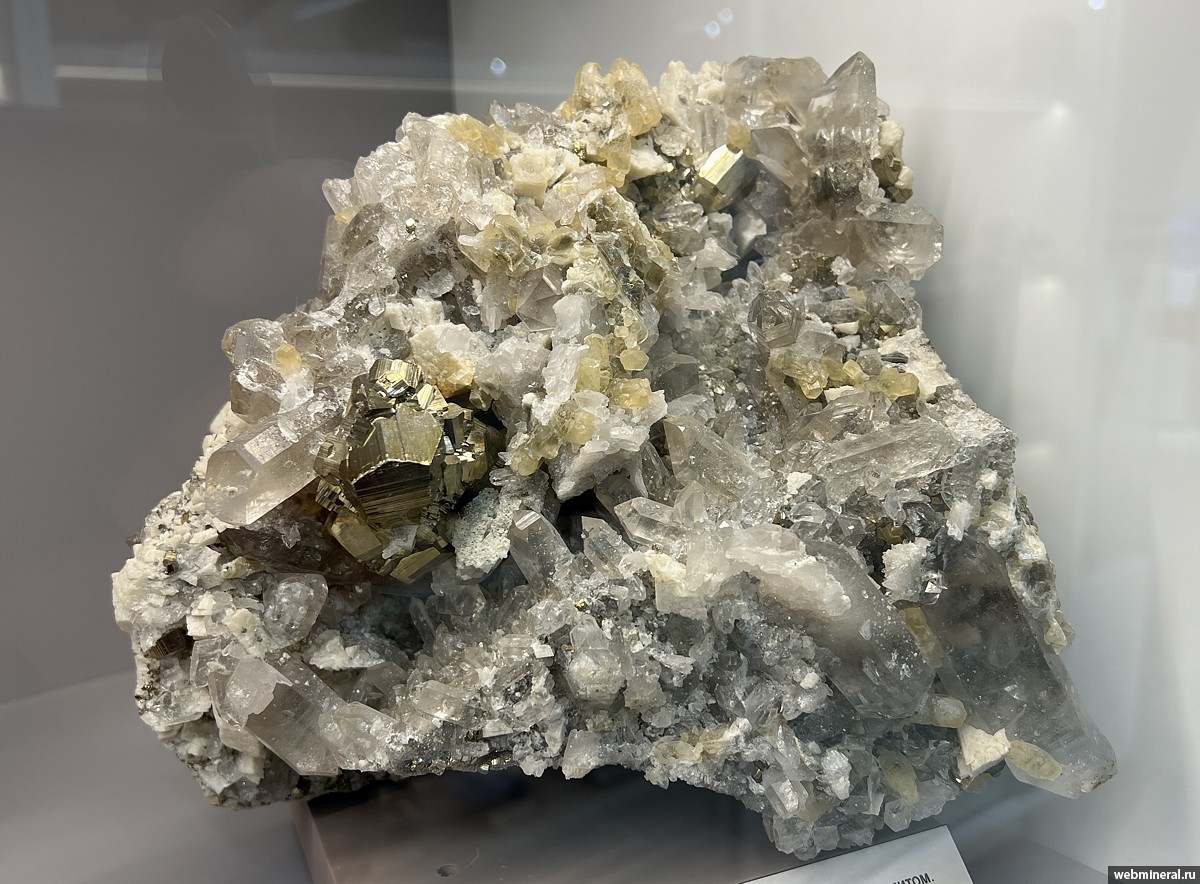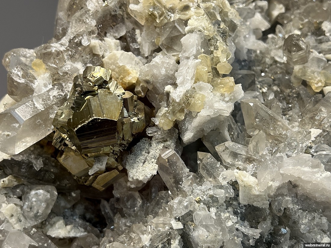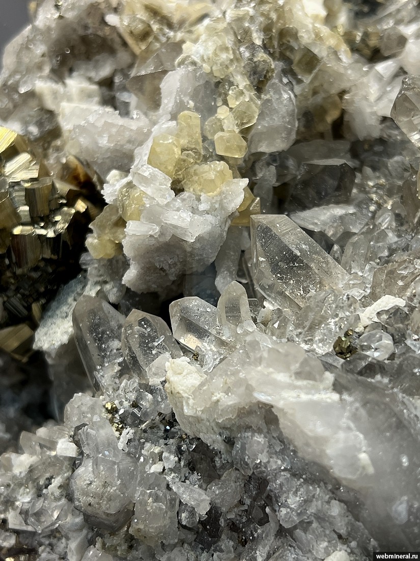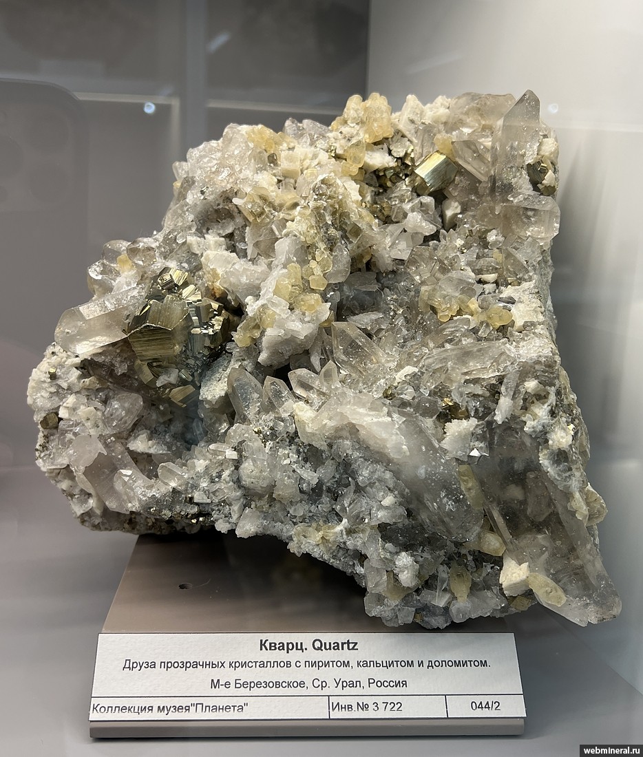 Друза сложенная кристаллами пирита (огранка - пентагондодекаэдр) размером до 2 см, прозрачными кристаллами кварца длиной до 4 см, желтым кальцитом и кристаллами доломита размером до 2 см. Образец из коллекции музея "Планета". Друза интересна богатым набором минералов (4 минвида).