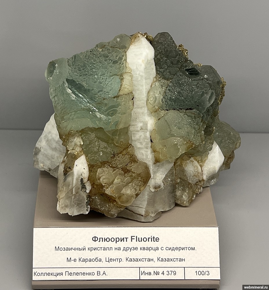 Мозаичный кристалл флюорита на друзе кварца с сидеритом. Образец из коллекции Пелепенко В.А.