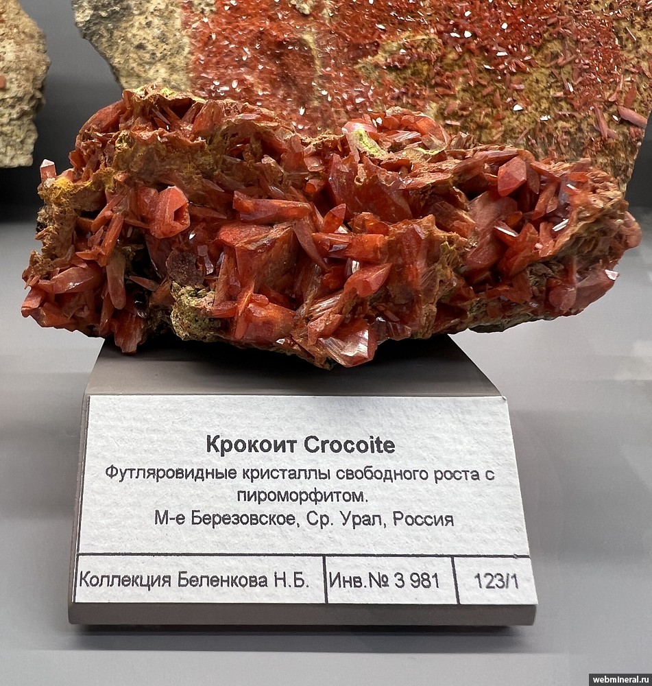 Футляровидные кристаллы крокоита свободного роста с пироморфитом. Образец из коллекции Беленкова Н.Б.