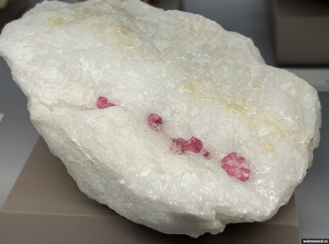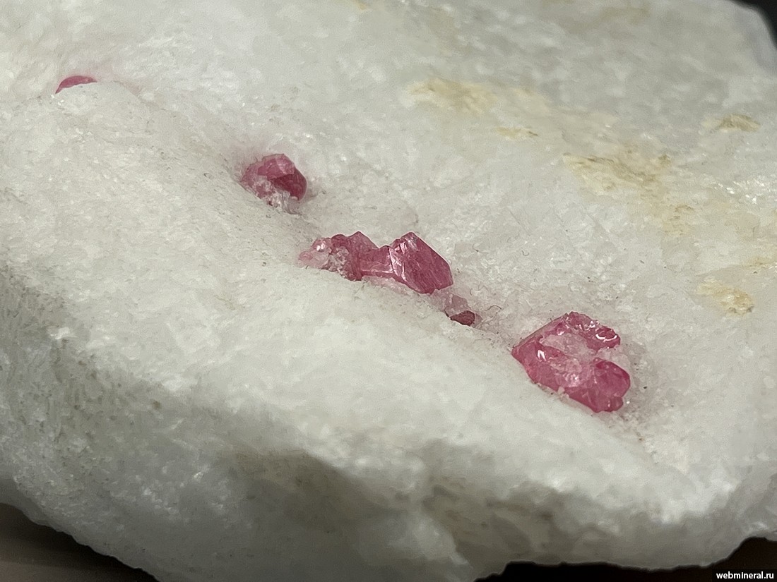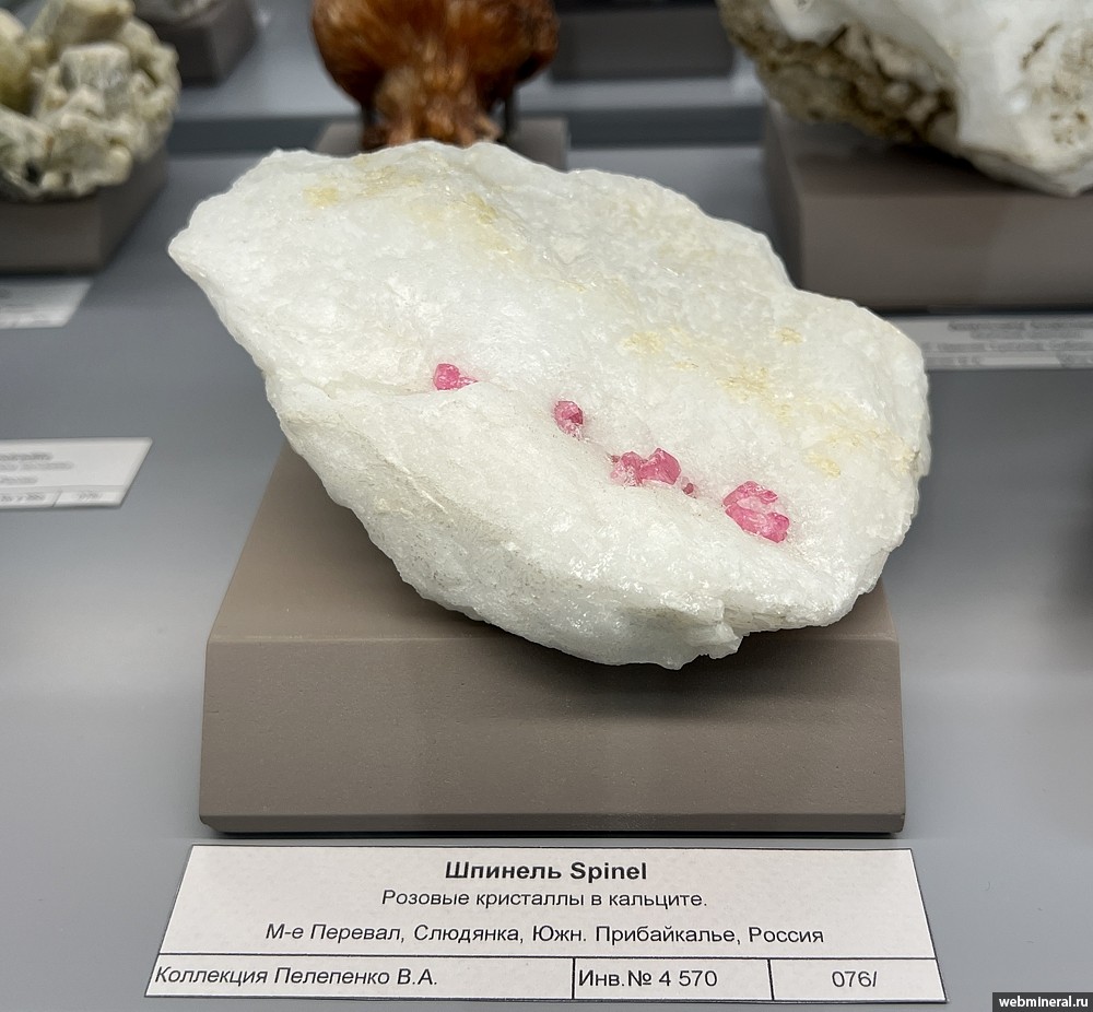 Кристаллы розовой шпинели размером до 1 см в кальците. Образец из коллекции Пелепенко В.А.