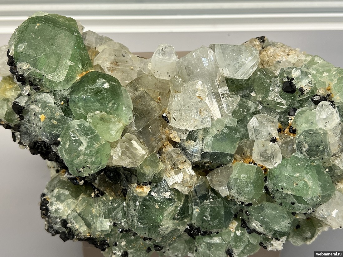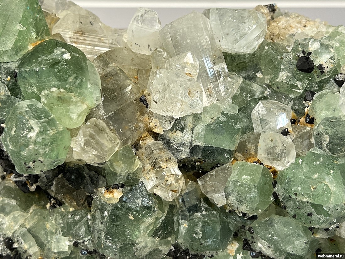 Друза кристаллов зеленого флюорита с топазом и касситеритом. Образец из коллекции Киреева А.Г.