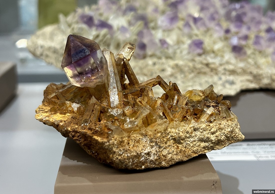 Скипетровидный кристалл аметиста на щетке лимонитизированного кварца. Образец из коллекции Миркамалова А.М.