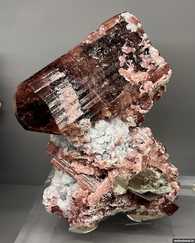 Друза кристаллов эльбаита длиной до 10 см с дымчатым кварцем и альбитом. Образец из коллекции Ивонина А.В.