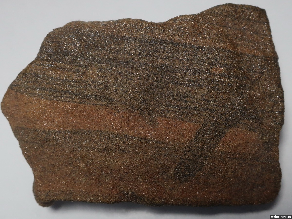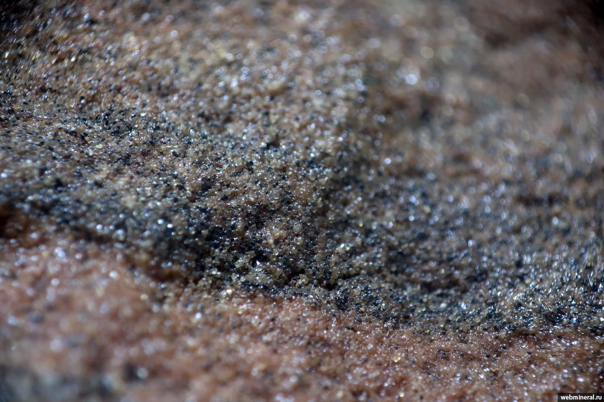 Мелкозернистый песчаник с обильными тонкими прослоями зерен размером до 2 мм черного ильменита. Сбор: 1961 г., Полканов Ю.А. (Институт минеральных ресурсов, Симферополь).