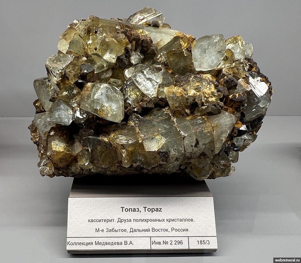 Друза кристаллов топаза с касситеритом. Образец из коллекции Медведева В.А.