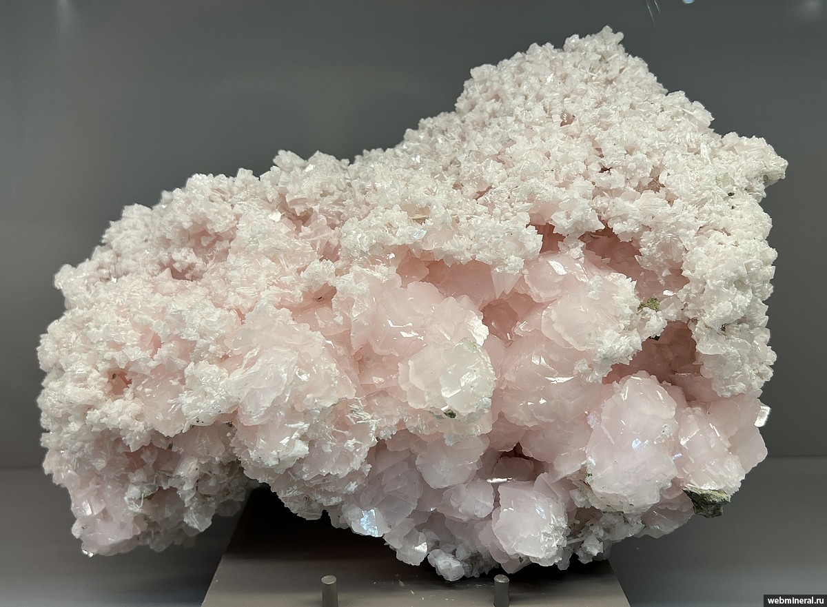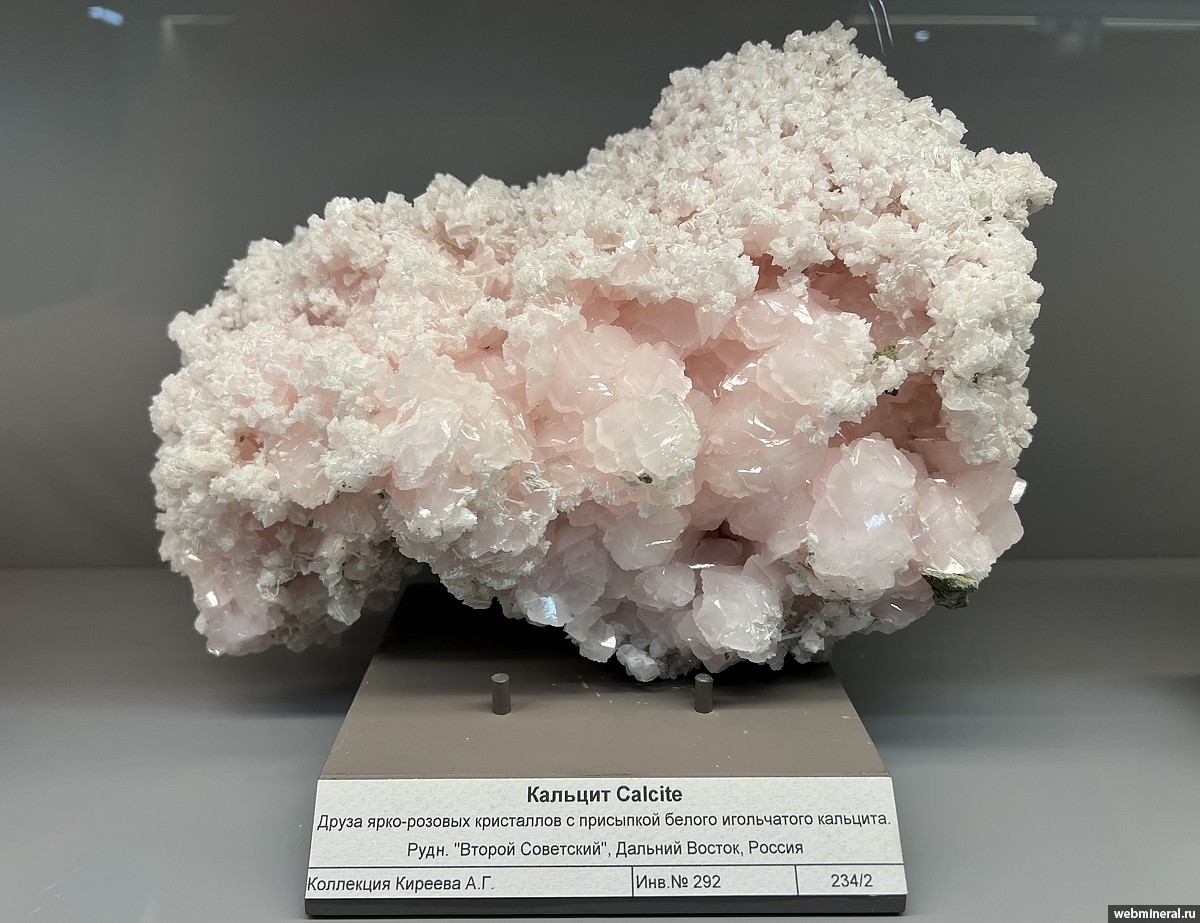 Друза ярко-розовых кристаллов кальцита с присыпкой белого игольчатого кальцита. Образец из коллекции Киреева А.Г.