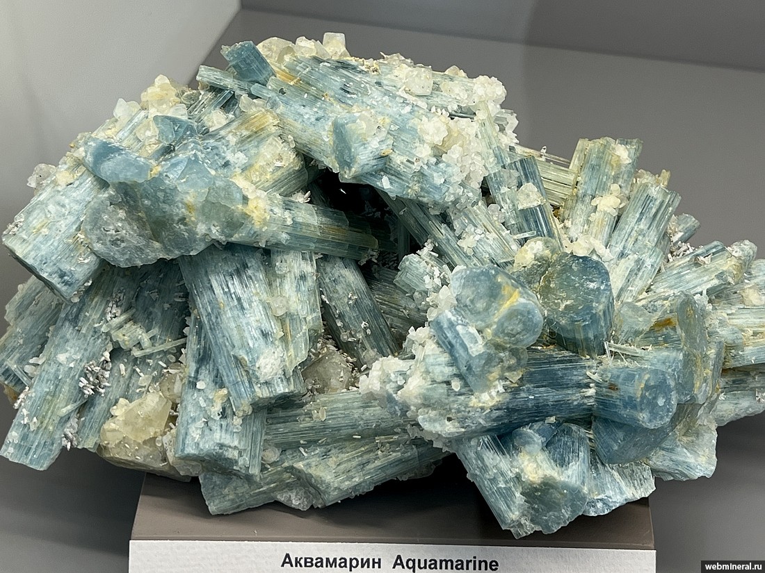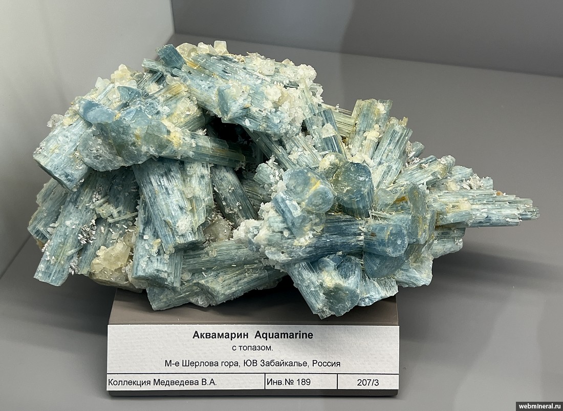 Друза призматических кристаллов голубого берилла (аквамарина) с мелкими кристаллами бесцветного топаза. Образец из коллекции Медведева В.А.