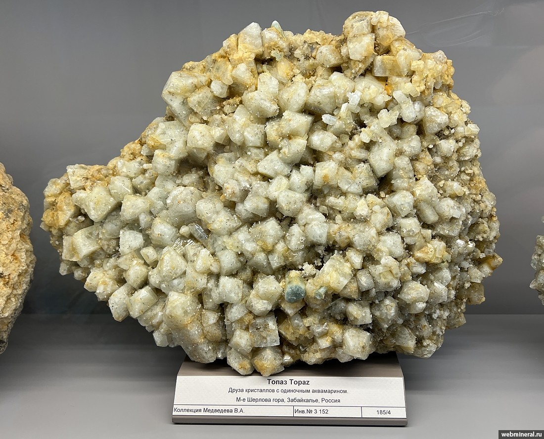 Друза кристаллов бесцветного топаза длиной до 6 см с одиночным аквамарином. Образец из коллекции Медведева В.А.