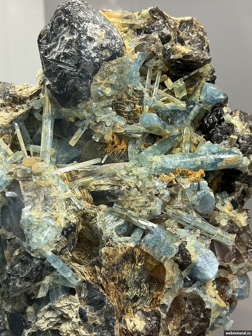 Друза кристаллов голубого берилла (аквамарина) на кварце (морионе). Образец из коллекции Медведева В.А.