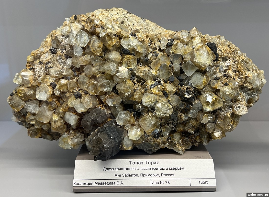 Друза кристаллов бесцветного топаза с кристаллами касситерита и дымчатым кварцем. Образец из коллекции Медведева В.А.