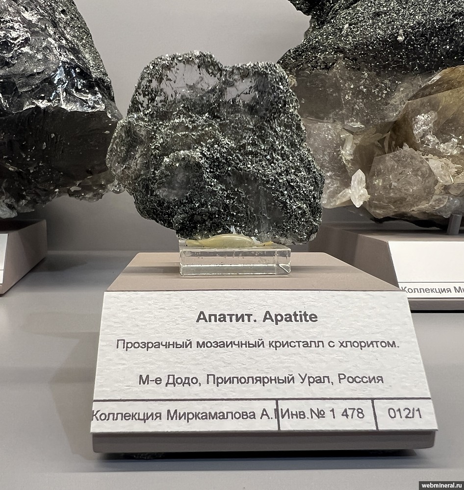 Прозрачный мозаичный кристалл бесцветного апатита присыпанные чешуйками хлорита. Образец из коллекции Миркамалова А.М.