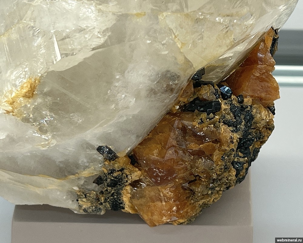 Кристалл кварца на оранжевом шеелите и черном касситерите. Образец из коллекции Пелепенко В.А.