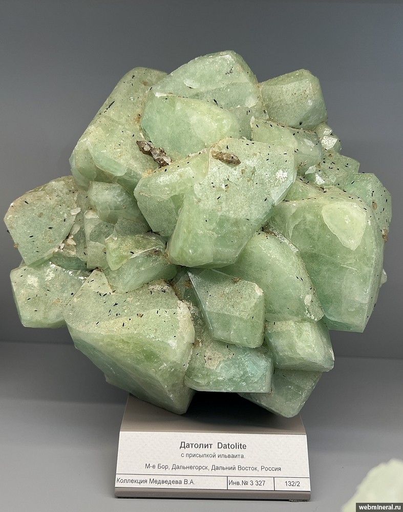 Друза кристаллов зеленого датолита с присыпкой мелких черных кристаллов ильваита. Образец из коллекции Медведева В.А.