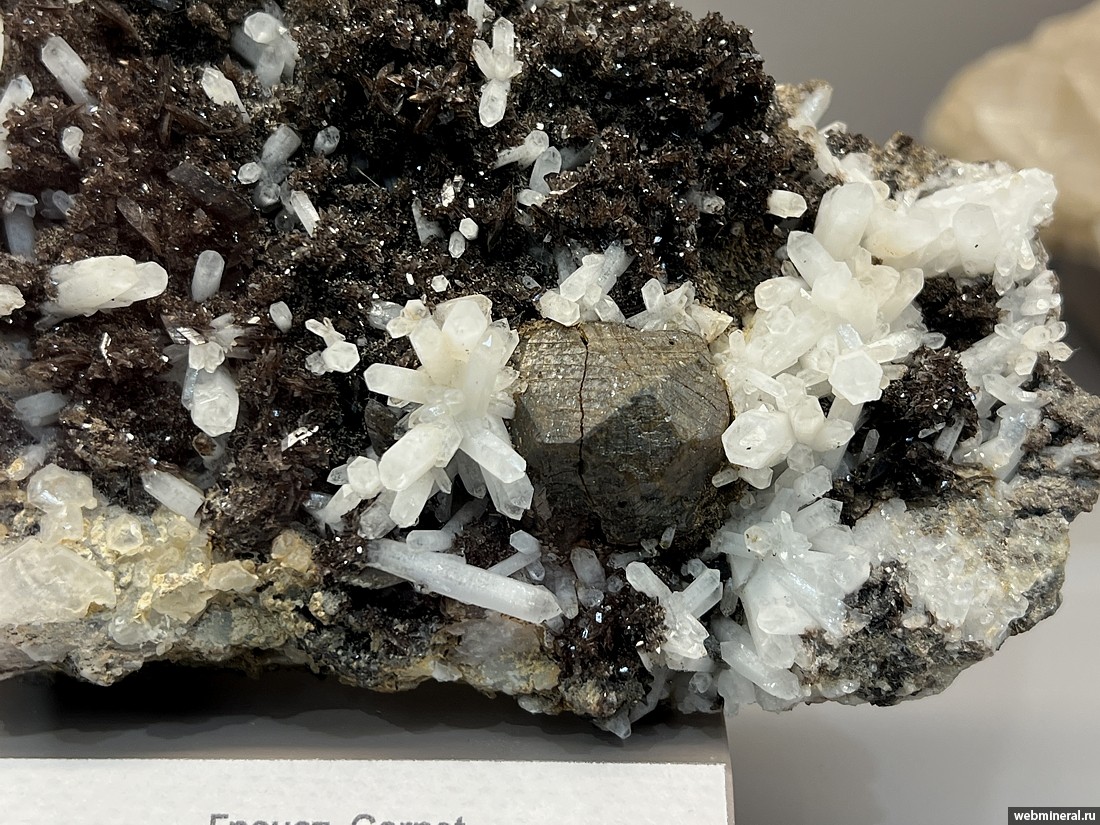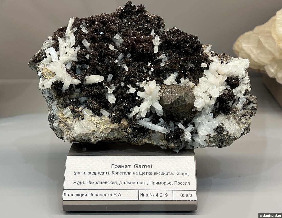 Кристалл андрадита размером ~ 2,5 см на щетке мелких кристаллов аксинита с кристаллами белого кварца. Образец из коллекции Пелепенко В.А.