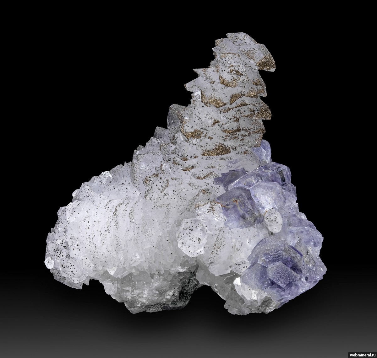 Сросток кристаллов фиолетового флюорита и розоватого кальцита, присыпанный пиритом.