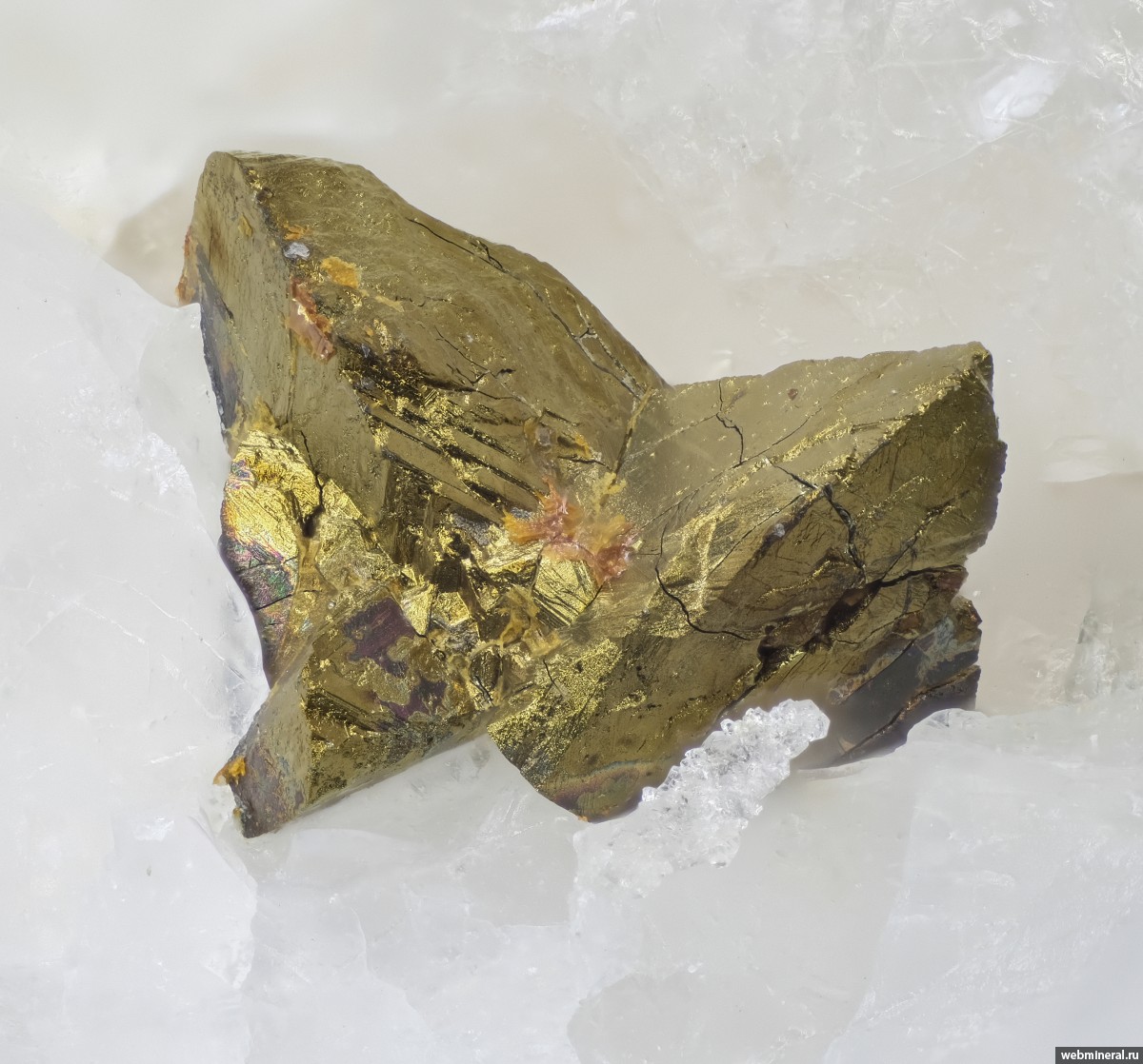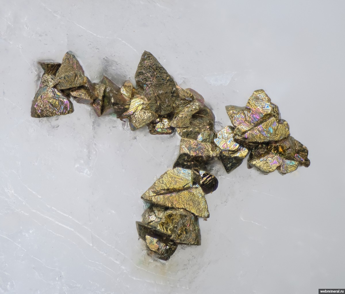 Халькопирит в кальците. Ширина сростка – 1,9 мм. Ширина двойника – 1,3 мм. Сборы - август 2024 года.