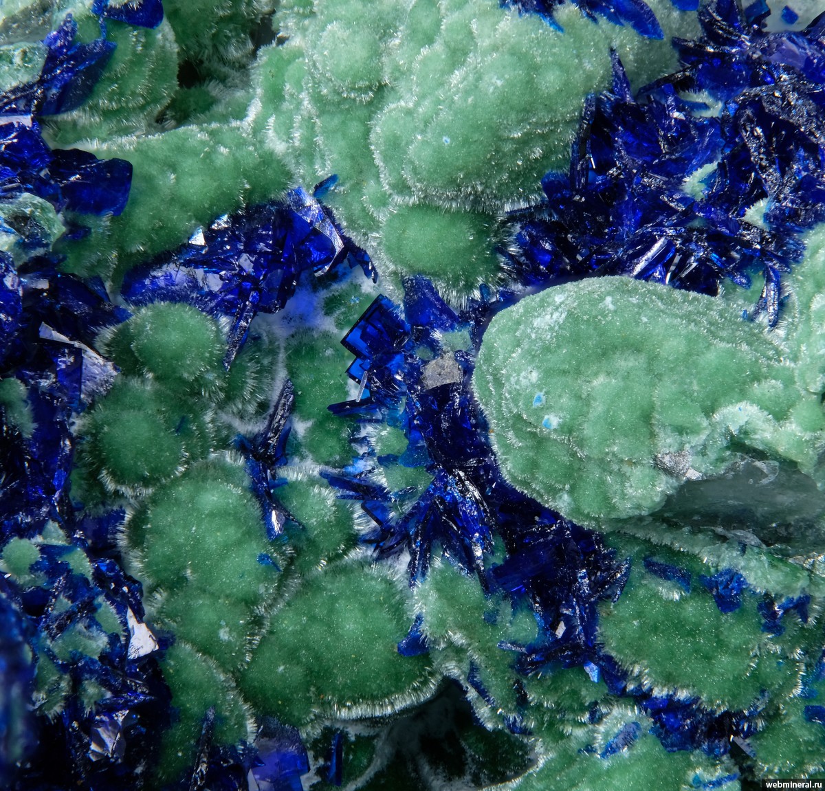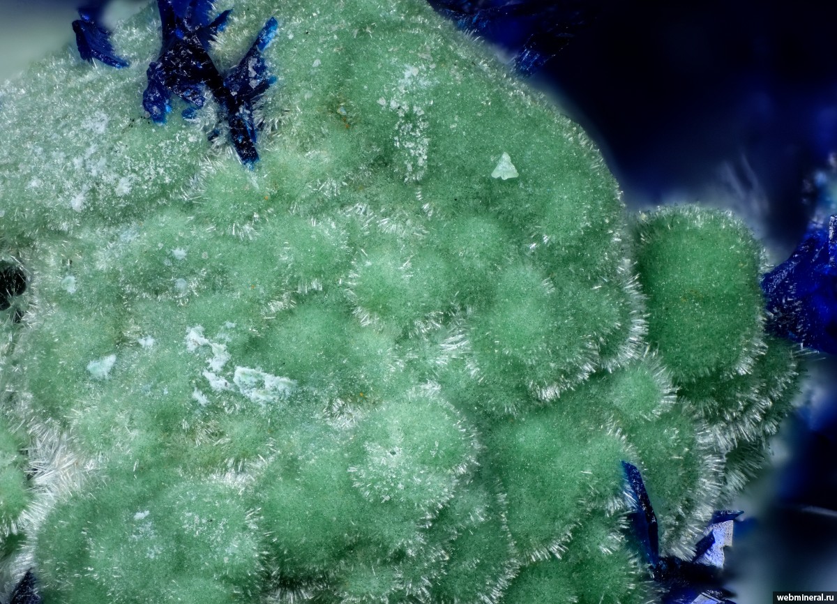 Сферолиты зеленого цинколивенита (анализ сходных образцов выполнил Касаткин А.В.) и кристаллы азурита в кварце. Гемма, апрель 2025 года.