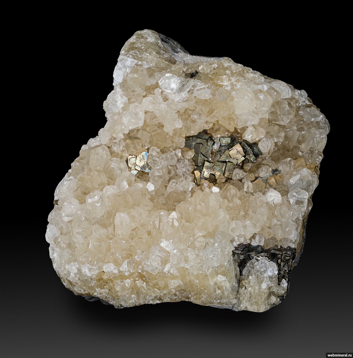 Сростки кристаллов пирита в кальците. Из коллекции Учителя М.Л. Надпись на этикетке: “Пирит в кальците. Михайловский р-к. КМА. 70-е”.