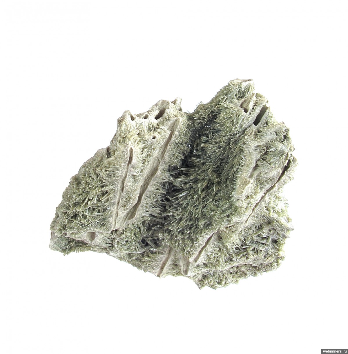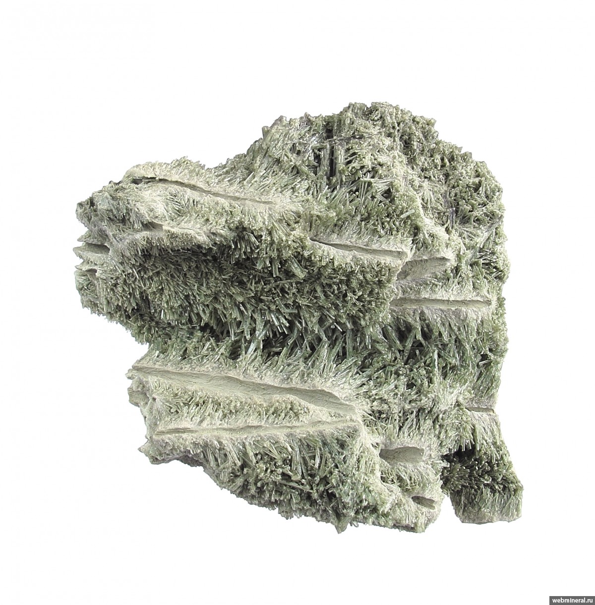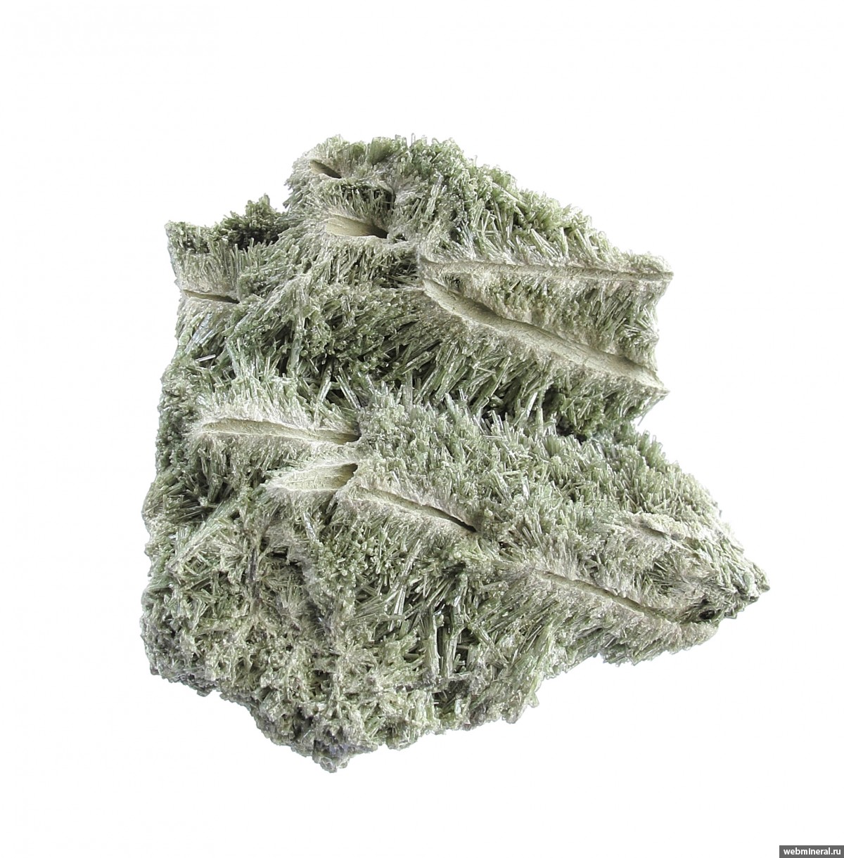 Тесно сросшиеся мономинеральные агрегаты диопсида в виде полых трубок, обросших щётками тонких немного уплощённых длиннопризматических кристаллов. Стенки трубок сложены белёсыми волокнистыми кристаллами. От стенок идёт расщеплённый рост, на удалении от каналов размер кристаллов увеличивается, и формируются друзовые агрегаты полупрозрачных кристаллов. Цвет - пыльный серовато-зелёный, светлый. Сборы 2025 г.